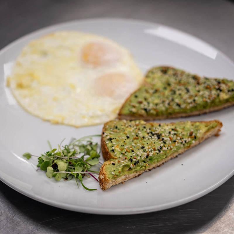 Eggs over easy and micro green on side