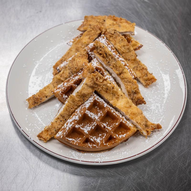 Fried chicken to perfection with crispy waffle served with warm side of syrup sausage