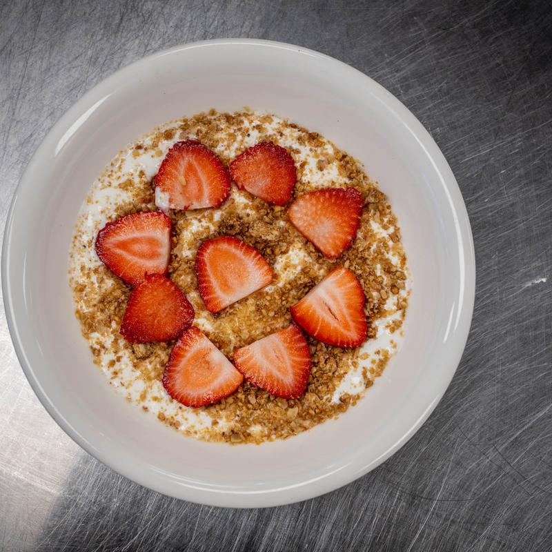 Vanilla yogurt with crunchy granola and fresh strawberries